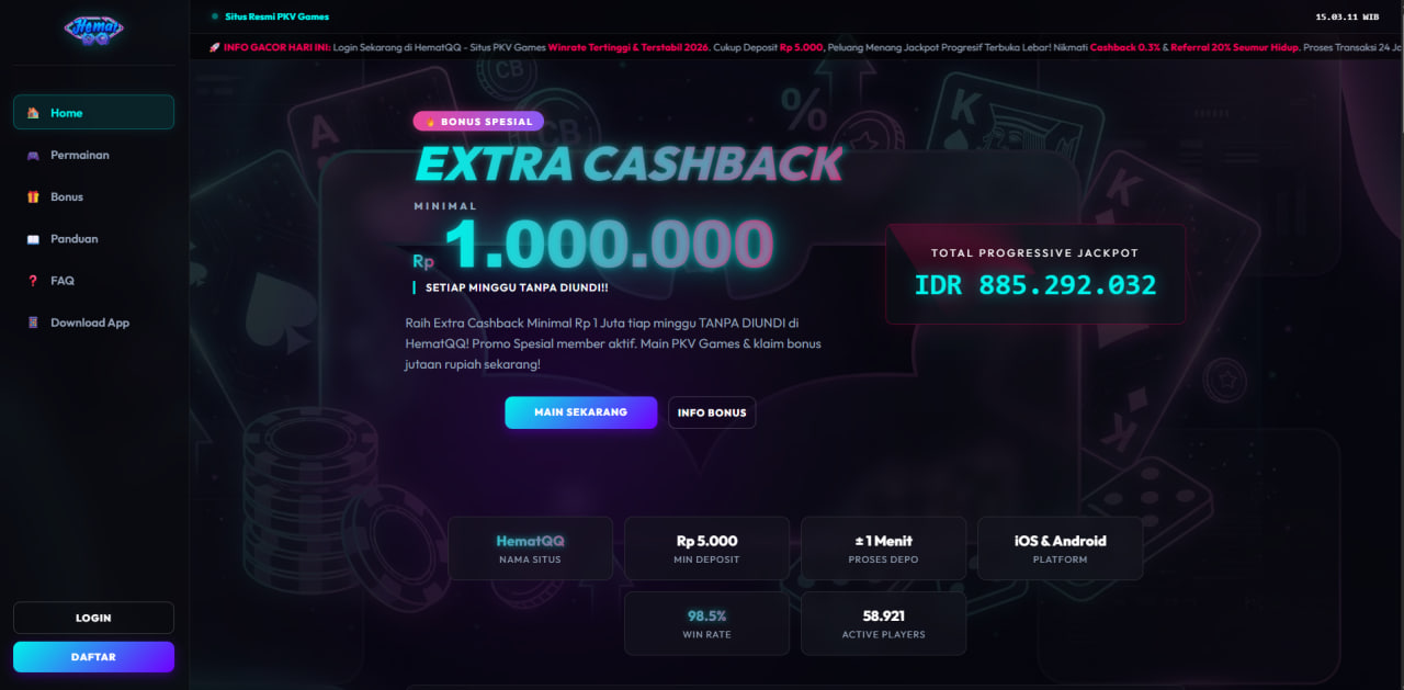 Raih Extra Cashback Minimal Rp 1 Juta tiap minggu TANPA DIUNDI di HematQQ! Promo Spesial member aktif. Main PKV Games & klaim bonus jutaan rupiah sekarang!
